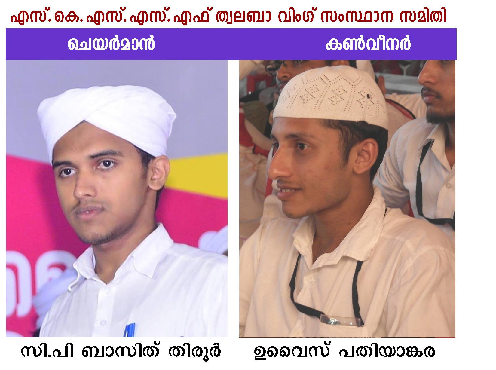 കോഴിക്കോട്: എസ്.കെ.എസ്.എസ്.എഫ് സംസ്ഥാന കമ്മിറ്റിക്കു കീഴിലുള്ള മത കലാലയങ്ങളിലെ വിദ്യാര്ത്ഥികൂട്ടായ്മയായ ത്വലബാവിംഗിന്റെ സംസ്ഥാന ചെയര്മാനായി സി.പി ബാസിത് ചെമ്പ്രയെയും ജനറല് കണ്വീനറായി ഉവൈസ് പതിയാങ്കരയെയും തെരഞ്ഞടുത്തു. സയ്യിദ് ഹമീദ് തങ്ങള് മഞ്ചേരി കോര്ഡിനേറ്ററാണ്.