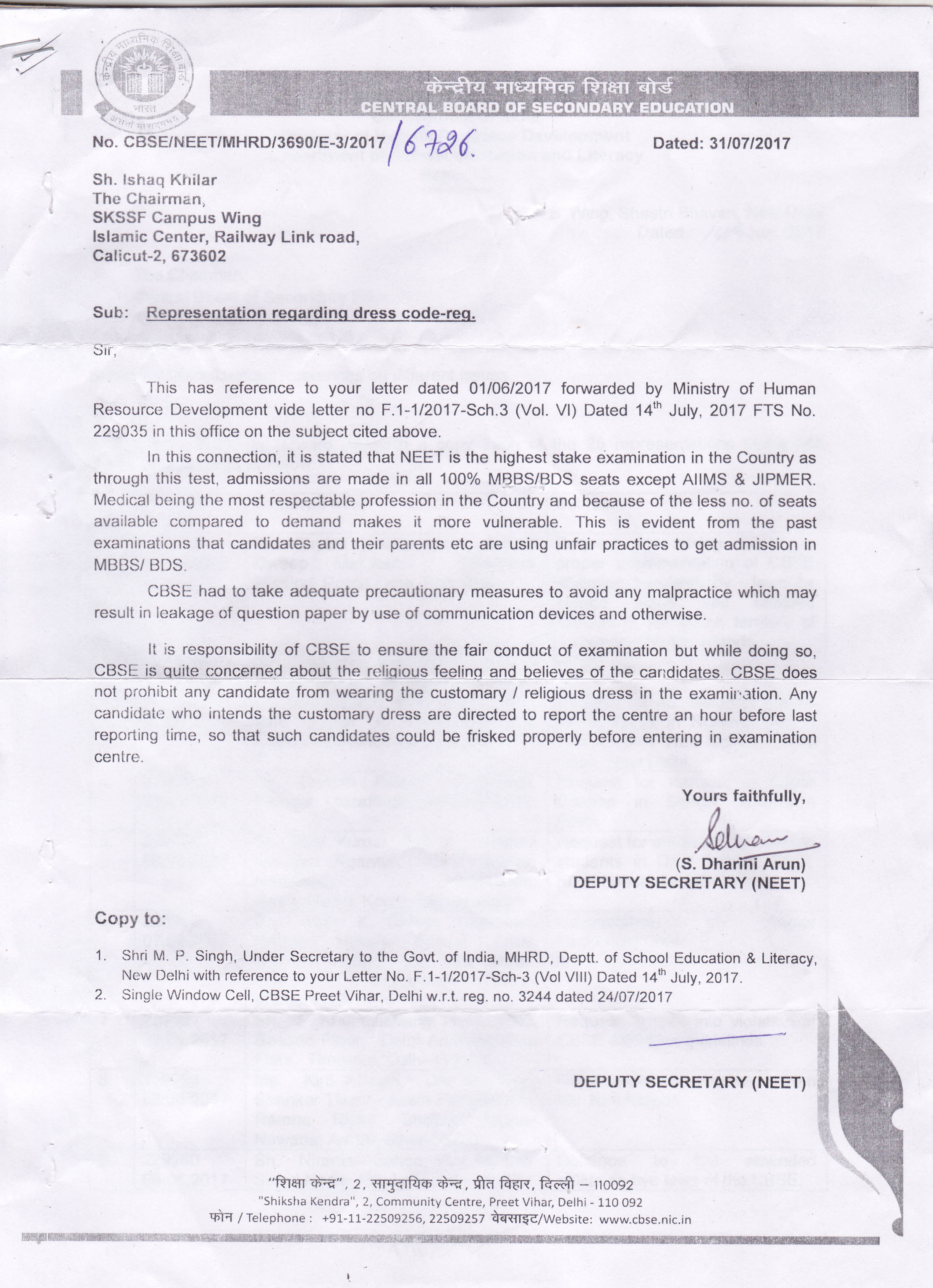 നേരത്തെ ക്യാംപസ് വിങ് അയച്ച പരാതി ശ്രീ.കൊടിക്കുന്നില് സുരേഷ് എം.പി, എം.എച്ച്.ആര്.ഡി മന്ത്രി പ്രകാശ് ജാവേദ്കറിന് സമര്പ്പിച്ചിരുന്നു. സി.ബി.എസ്.ഇയുടേതല്ലാത്ത നിര്ദ്ദേശങ്ങളുടെ പേരില് വിദ്യാര്ഥികളെ ബുദ്ധിമുട്ടിച്ച പരീക്ഷാ കേന്ദ്രങ്ങള്ക്കെതിരെ സര്ക്കാര് നടപടിയെടുക്കണമെന്നും ക്യാംപസ് വിങ് ആവശ്യപ്പെട്ടു.