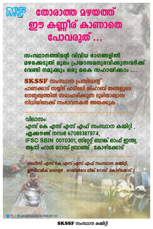 കോഴിക്കോട്: മഴക്കെടുതിയെ തുടർന്ന് സംസ്ഥാനത്തിന്റെ വിവിധ ഭാഗങ്ങളിൽ ദുരിതമനുഭവിക്കുന്ന സഹോദരങ്ങളെ സഹായിക്കുന്നതിന് വേണ്ടി ദുരിതാശ്വാസ നിധി സമാഹരിക്കാൻ എസ് കെ എസ് എസ് എഫ് സംസ്ഥാന കമ്മിറ്റി തീരുമാനിച്ചു.
